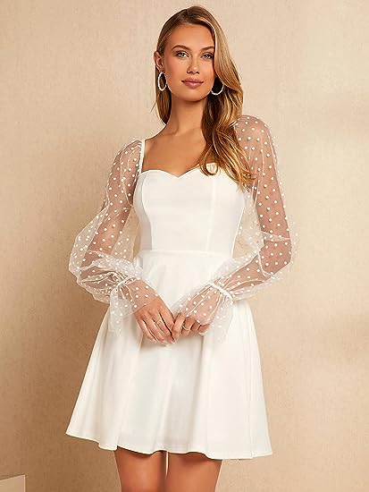 Features: sweetheart neckline, sheer mesh long sleeve, polka dots, high waisted, a line, flared hem, mini dress.